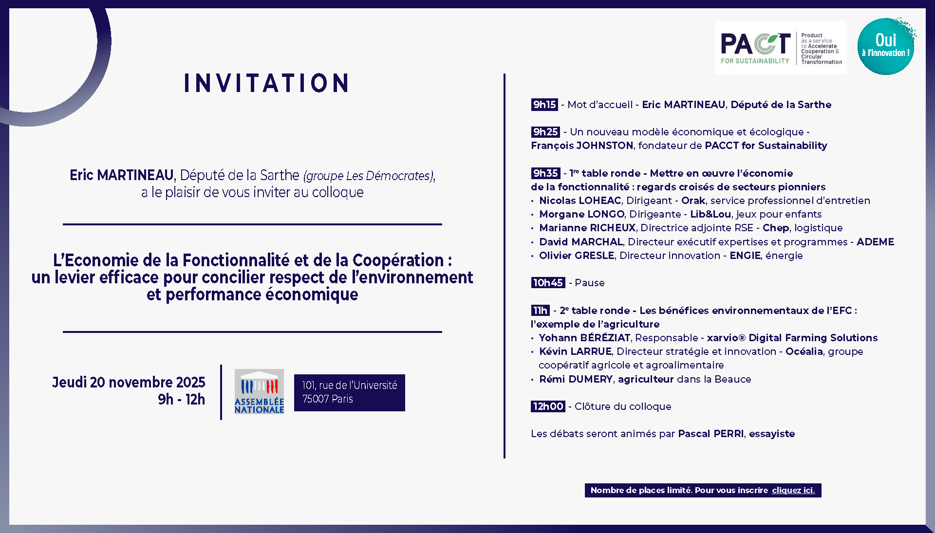 Colloque sur l’Economie de la Fonctionnalité et de la CoopérationOui à l'innovation !20 novembre 2025Actualités, Economie 20 novembre 2025 Assemblée Nationale Sur le même sujet# Agriculture# colloque# Economie de la Fonctionnalité et de la Coopération# EFC